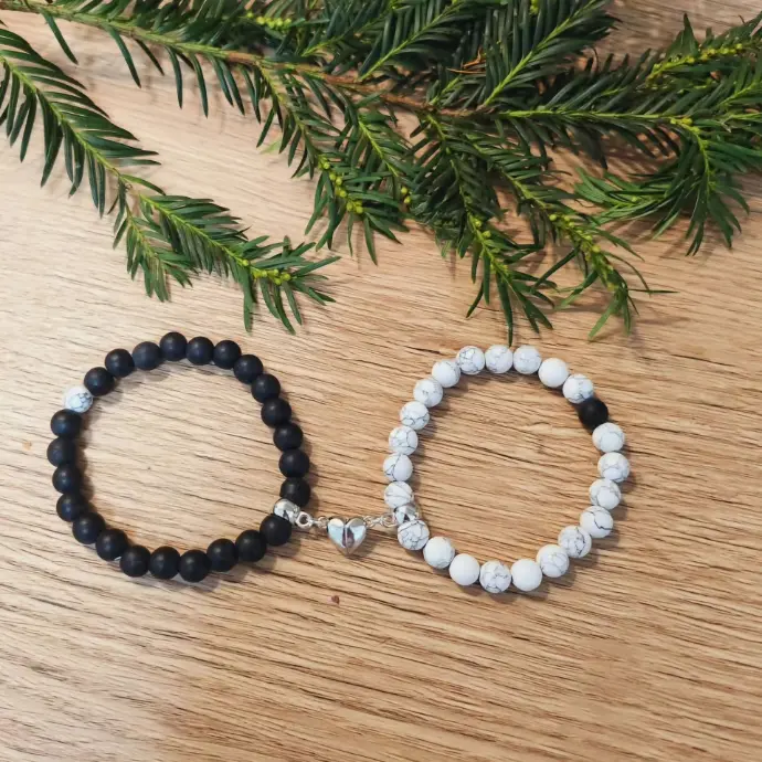 • Des bracelets de couple avec un cœur aimanté qui se reforme lorsque que l'on se tient par la main + pochette cadeau